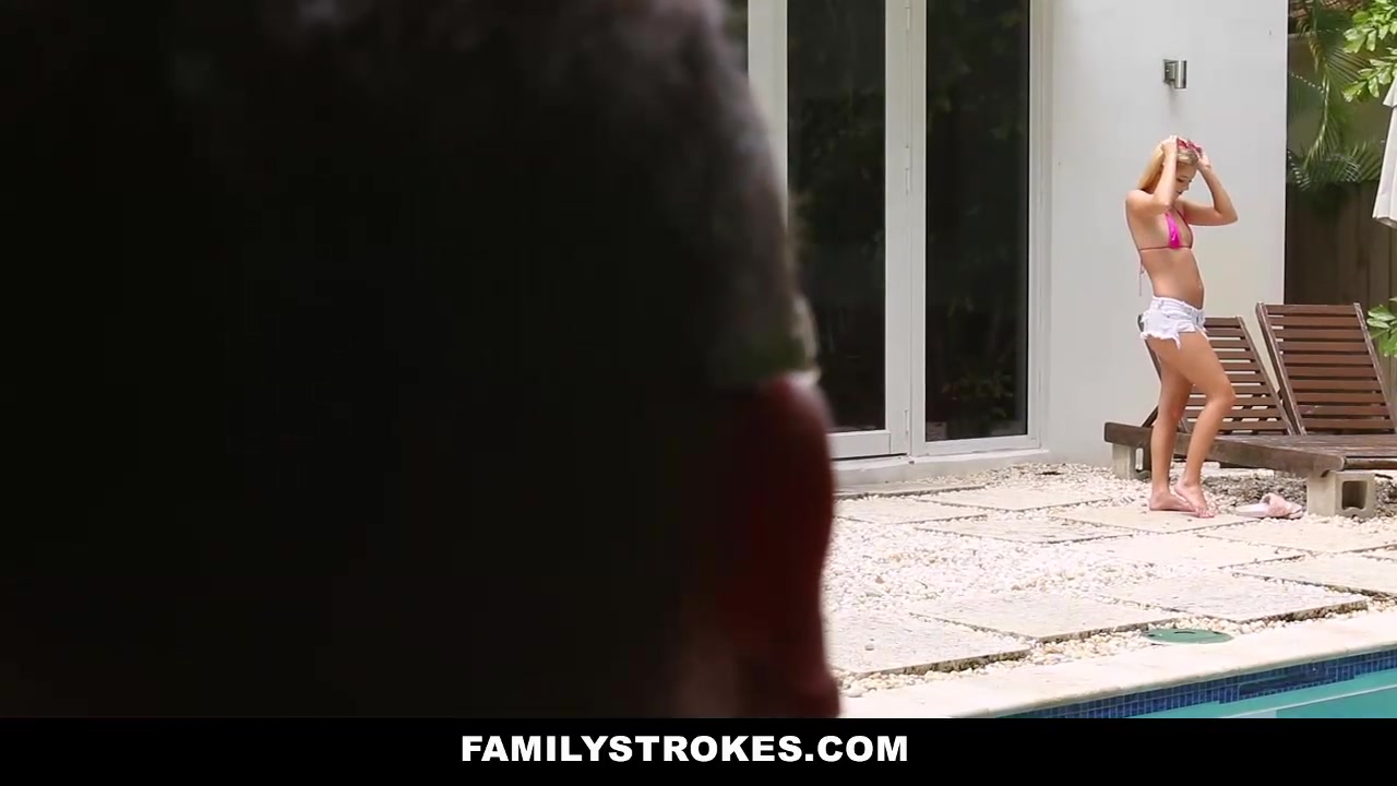 Riley Star is visiting her uncle and cousin. Not only because she lovers her family, but they have the nicest pool ever, and she would like a summer job with her uncle. When she asks her uncle to oil her up her cousin pulls her aside and tells her she can't fool him. She does not deny, but instead grabs that cock and sucks him out back before getting fucked on the pool steps.