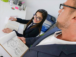 Emily Willis has not been performing well in school so her parents hired a hard ass tutor for her. He threw all traditional education techniques out the window, bent emily over his knees, and gave her a stiff spanking with a heavy book. Emily started to only laugh and get pleasure from this, which was really off putting for her tutor. He tooks things to the next level and began to grope her and fiddle with her pussy. Before long she was sucking his cock, getting impaled by his dick.