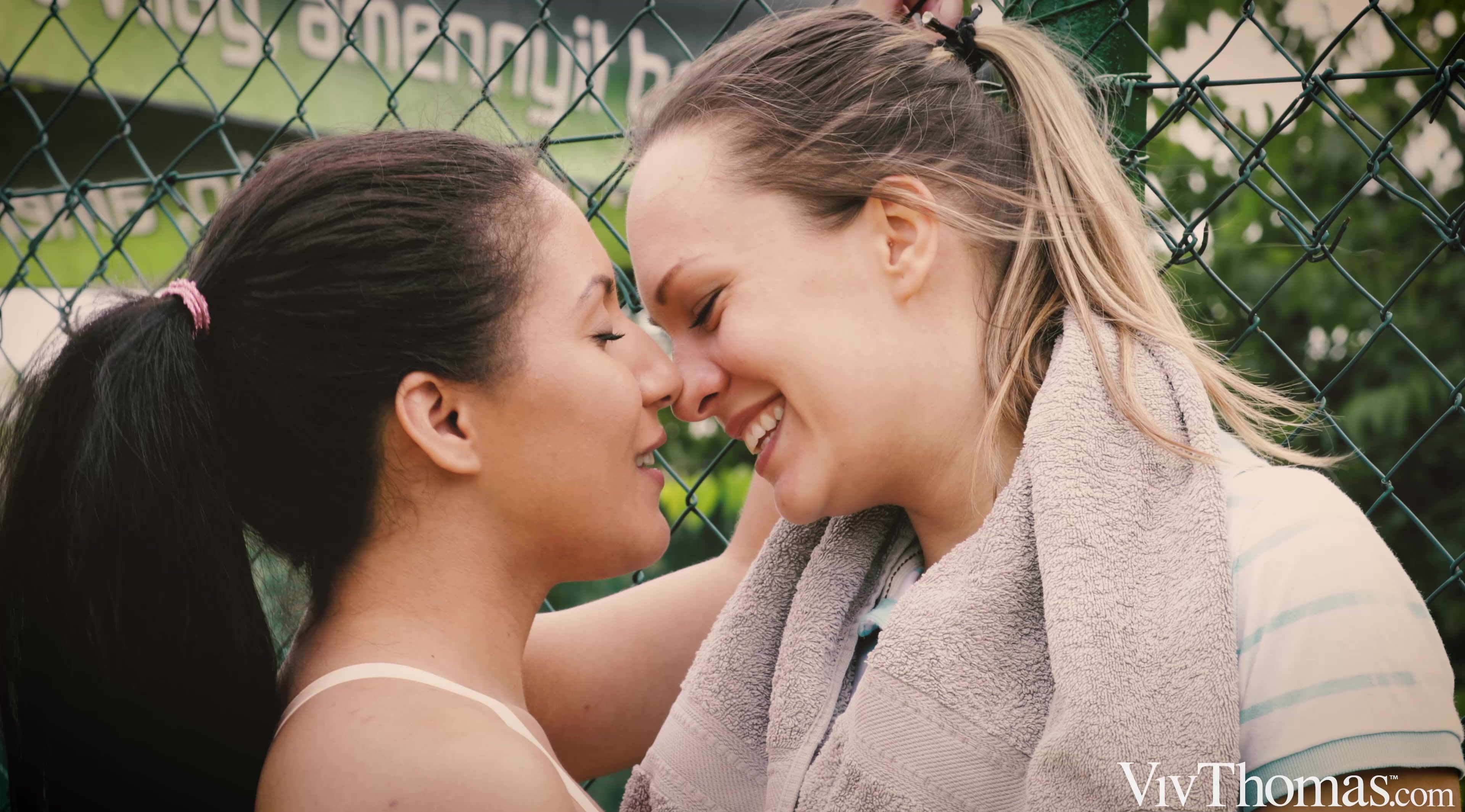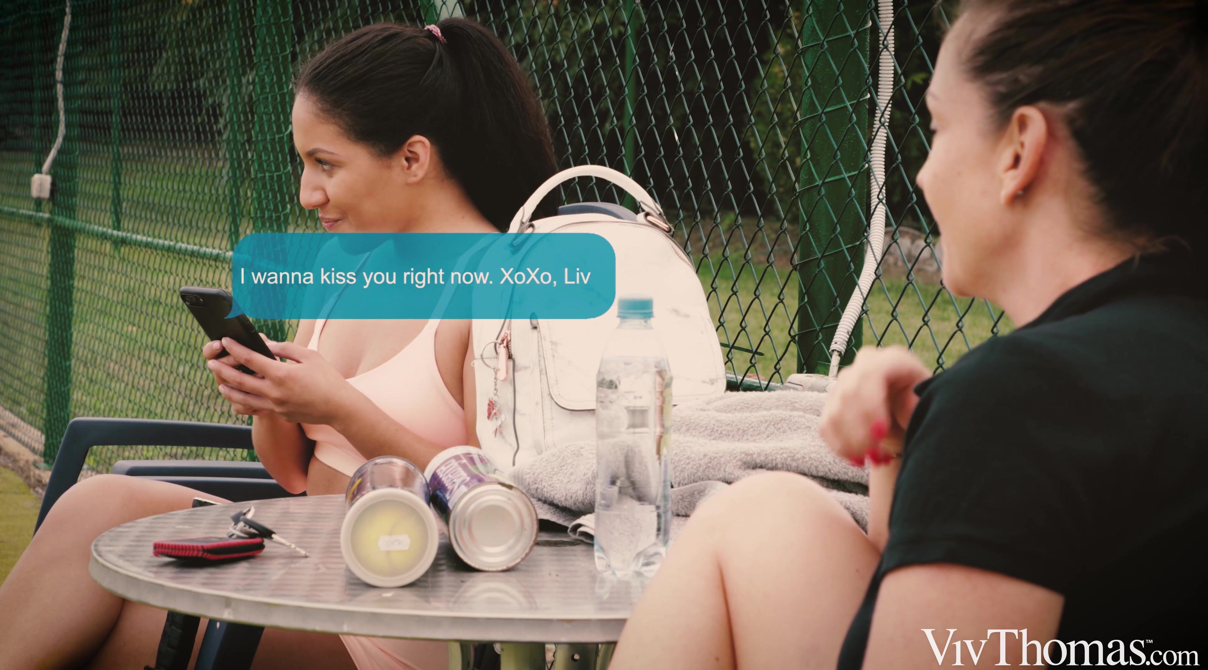Gorgeous blonde Blue Angel is playing tennis with Eve Angel, as Sandra Shine’s hot lesbian movie “Runaway Girl” begins. When Sandra – making a cameo appearance – and sexy brunette Liv Revamped show up on court, Blue can’t resist flirting. Her game gets wild – look out for the legendary Viv Thomas himself in a cameo, returning her ball – and petite Liv acts on her attraction, sending a text message to make her feelings plain. As the game is finished, Liv returns to claim her kiss, pushing her new friend up against the wire fence of the tennis court and caressing her breasts. She teases Blue’s stiff nipples and slides a hand up her skirt to stroke her through her panties, then pulls them down and kneels to lick her puffy clit. Blue squirms and moans as Liv eats her to an intense orgasm. To Blue’s confusion, Liv abruptly walks away. A few days later, Blue decides to text her address to her runaway lover. She greets her in the bedroom, dressed up in sexy lingerie and stockings. The two beauties kiss hungrily, before Blue lavishes attention on Liv’s breasts, then tugs her panties aside and licks her pussy skilfully. She strips down to her stockings and straddles Liz in a sixty-nine, so they can eat each other to mutual bliss. Liz climaxes first, shuddering and gasping, and Blue sits on her face to ride to a powerful orgasm of her own. But Liz’s games are not over yet…