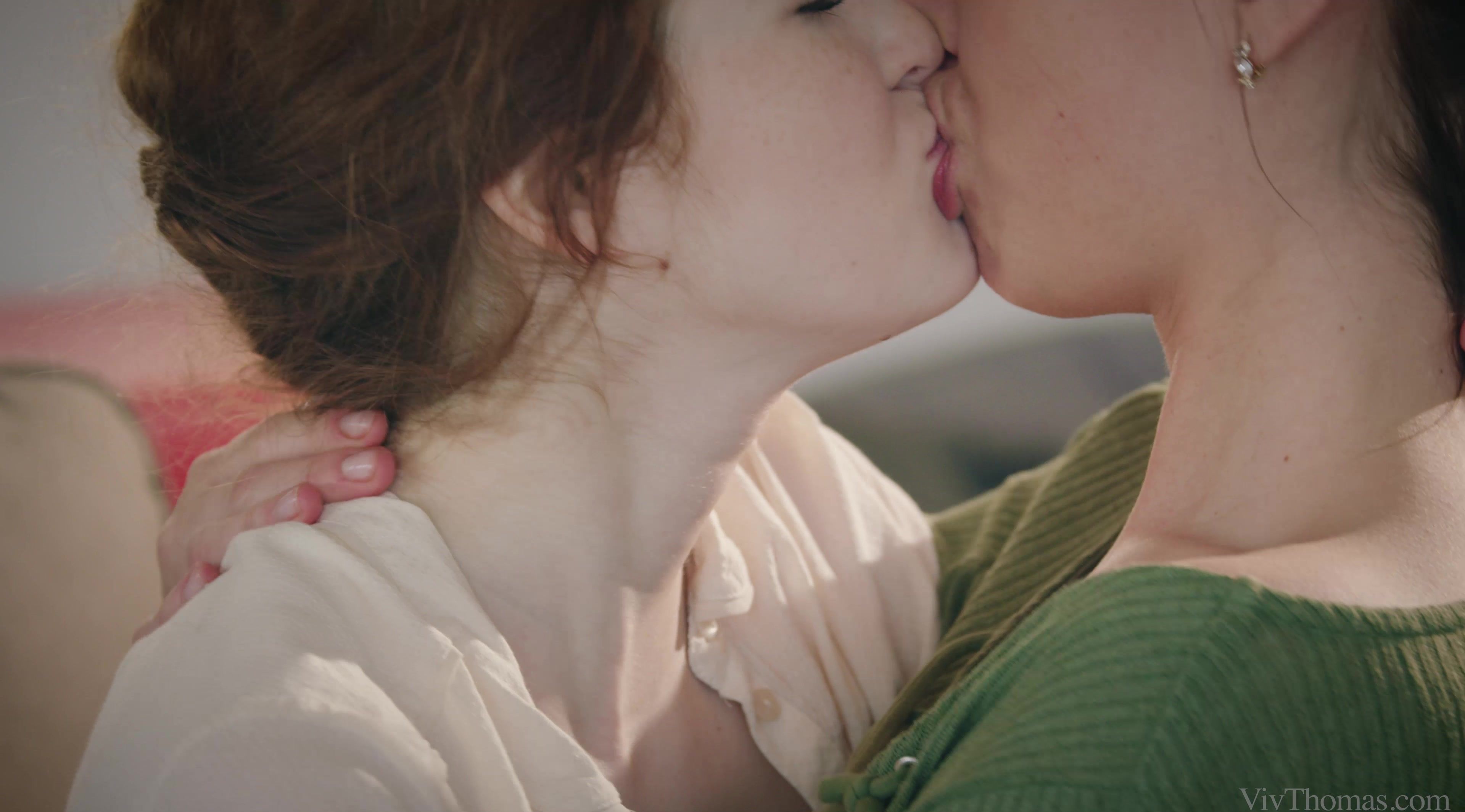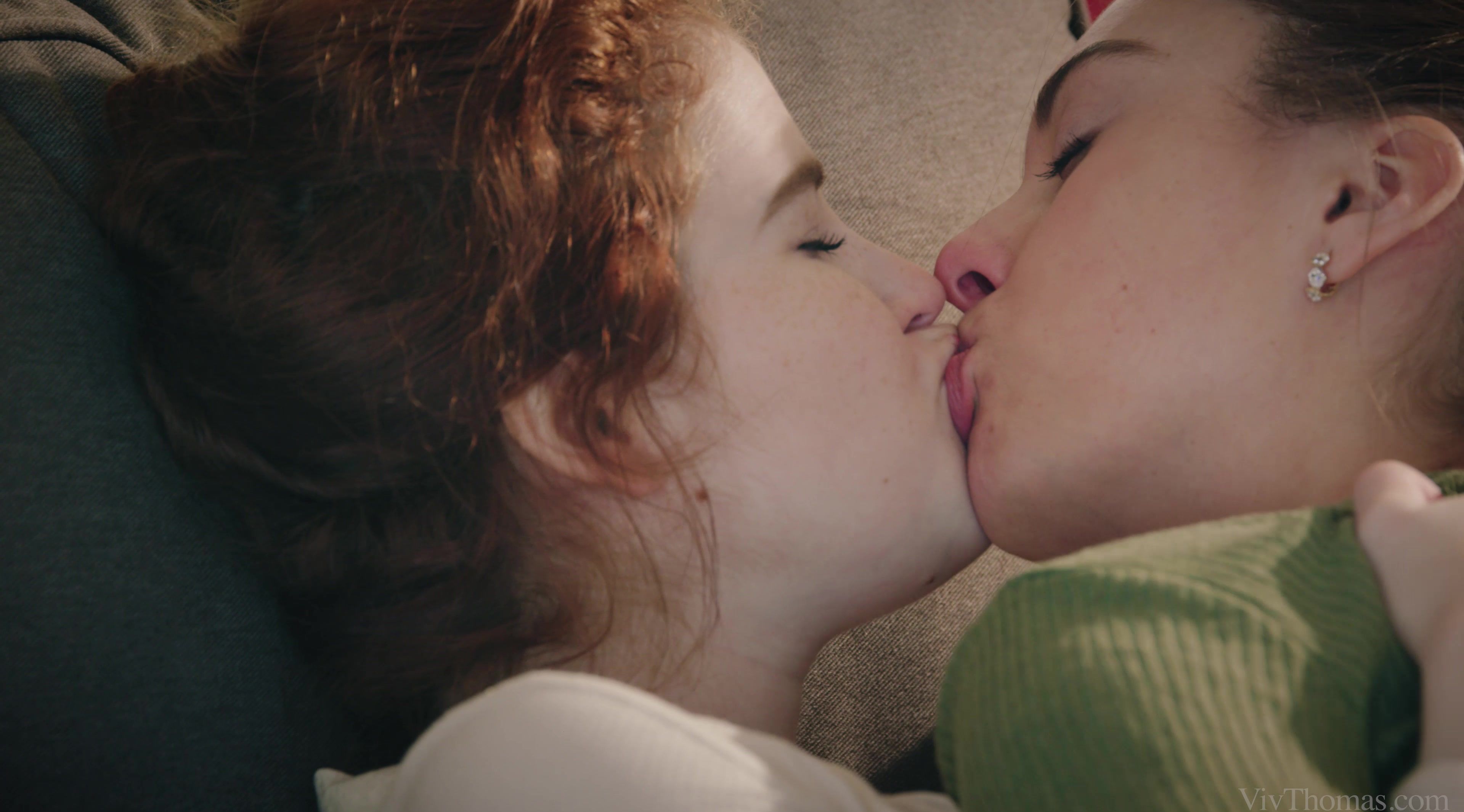 Hot redhead Adel C masturbates to an erotic movie as her girlfriend Sabrisse watches, as episode two of Alis Locanta’s steamy love triangle “Lesbian Stories Volume Two” begins. The expression on Sabrisse’s pretty face betrays how turned on she is, as she watches Adel thrust a hand into her tight cut-offs and stroke herself to an orgasm that makes her whole body tremble. Sabrisse dives on top of Adel and kisses her avidly; Adel flips her lover onto her back and sucks her nipples, then tugs down her jeans, spit-lubes two fingers and drives them into her pussy. Sabrisse’s hips rock as she rides Adel’s fingers to an intense orgasm, but Adel’s not done with her yet. She spreads Sabrisse’s thighs and eats her pussy voraciously, driving her wild. Sabrisse straddles Adel’s lap and grinds on her until she climaxes again, then undresses her roughly and goes down to eat her shaved pussy. When Adel is at fever pitch, Sabrisse frigs her vigorously as she rubs her clit, pushing her over the edge. The darlings kiss tenderly, but it remains to be seen how their love triangle will play out…