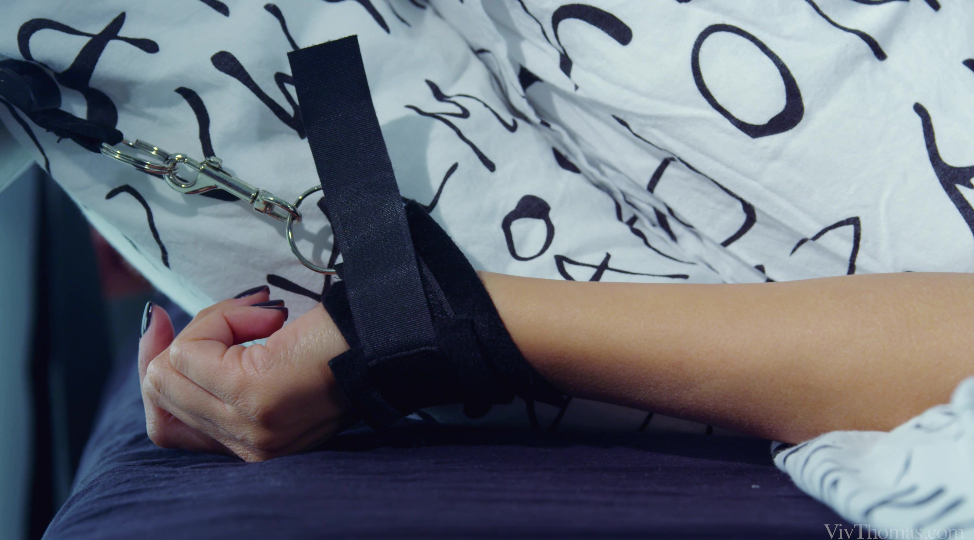 French fox Anissa Kate looks shockingly beautiful in nipples clamps and a pony bit gag over the opening credits. In contrast, Henessy is casual and relaxed in jeans, but as she begins to speak about her first experiences with BDSM, it becomes clear she is just as kinky as her girlfriend. We see Anissa strap her wrists to the metal bars of the staircase and then masturbate to an orgasm, with Henessy unable to touch her. Anissa then binds Henessy’s wrists together and tugs her jeans down, spanking her ass and fingering her roughly until she comes. Henessy kneels to eat Anissa’s pussy, her wrists still bound, making her climax. Henessy then takes the dominant role, restraining Anissa to the bed by her wrists and ankles and sitting on her face, riding hard. She releases Anissa’s hands and turns into a sixty-nine, getting her ass fingered and her pussy licked until she comes.