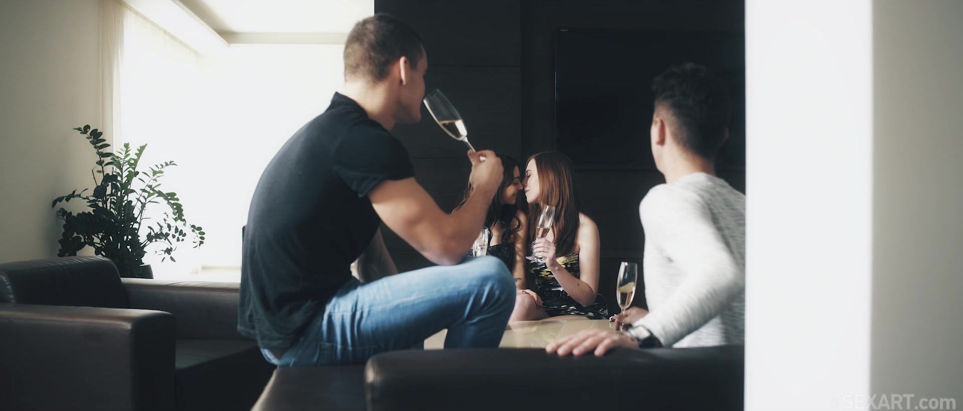 Sexy redhead Linda Sweet kisses her brunette girlfriend Tera Link while the guys watch avidly, as episode four of Andrej Lupin’s sensational erotic series “Free House” begins. Maxmilian Dior is house sitting when his buddy Nick Ross shows up with the babes and some bottles of bubbly, ready to party. Soon the horny sweethearts are tangling tongues and fondling each other’s breasts, enjoying the thrill of putting on a show for their enthusiastic audience. The men watch as Tera lies back on the coffee table so Linda can peel off her pantyhose and lick her shaved pussy. While Linda’s tongue flicks between her pussy lips, Maxmilian sucks Tera’s stiff nipples, and Nick gets in on the action, fingering Linda from behind. Once Tera is naked, Nick takes over eating and fingering her pussy. When he breaks off to kiss Linda, Tera crawls across the table to Maxmilian, unzips his jeans and pulls out his hard cock. She licks and sucks it deep, looking up at him adoringly, while Linda jerks and sucks Nick’s dick energetically, and Nick reaches across to stroke Tera’s pussy. The babes switch partners, Nick plowing into Tera in missionary while Linda rides the seated Maxmilian in reverse cowgirl, her clit piercing gleaming beneath her natural red bush. She leans forward to kiss Tera as they both get fucked hard. The sound of flesh slapping on flesh as cocks drive into pussies increases in volume when they form a naked fuck train, with Maxmilian standing screwing Linda from behind, while Tera caresses her perfect breasts and frigs her clit, and Nick doggy bangs Tera. Switching partners again, Tera rides Maxmilian in a standing reverse cowgirl while Linda hooks her leg over Nick’s shoulder as he humps her. Tera’s orgasm is intense, making her shudder uncontrollably, and Linda gasps and moans through her climax, tits jiggling with each thrust of Nick’s cock. Tera kneels to suck and jerk Maxmilian’s over her breasts as Nick spurts a hot load over Linda’s belly. The guys are spent, but the look the babes give each other suggests they might not be finished just yet…