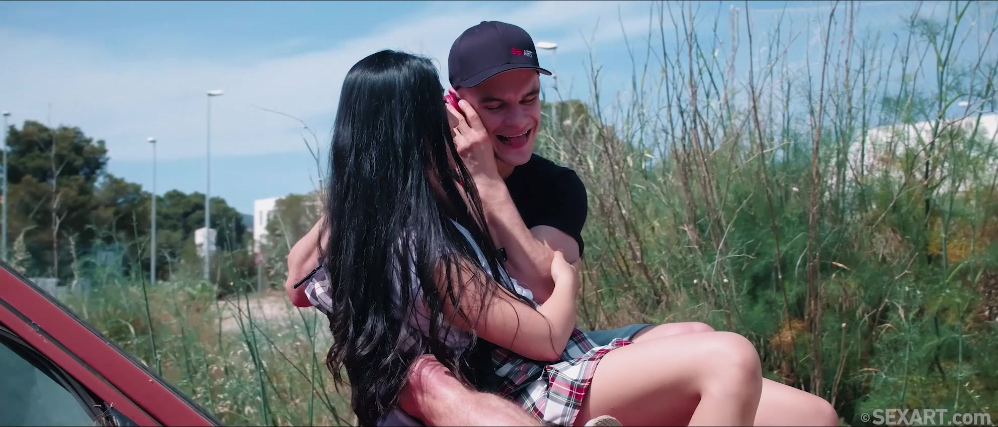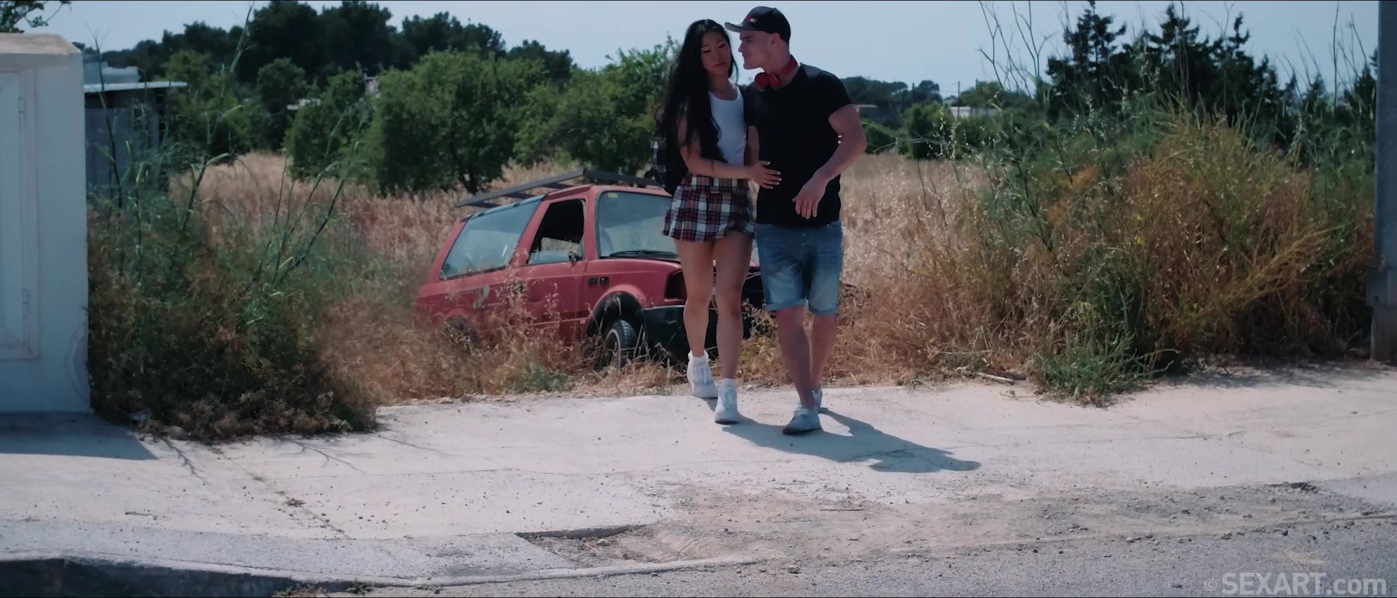 As “Hold Me Baby” begins, cute Asian college babe Katana comes running down the street to jump into the arms of Maxmilian Dior, looking so sexy in her white T-shirt and little plaid skirt, ankle socks and white pumps. The sweet lovers kiss and listen to music as they walk home together; as soon as they reach Katana’s backyard she straddles her man, grinding on his lap. Maxmilian sucks on Katana’s tiny titties and she slides to her knees, tugging down his shorts and stroking his stiffening dick, slapping it against her tongue and sliding her lips up and down around his thick shaft. Peeling off her white cotton panties, Katana sits astride Maxmilian and guides his cock into her tight little pussy, humping vigorously, rising and falling as she rides him. She’s glistening with perspiration as Maxmilian flips her onto her back; even then she can’t stop rocking and bucking, thrusting back at him, until she’s got her leg over his shoulder and two fingers grinding her clit urgently. He pumps into her deep and hard, lips on her dark nipples, relishing her cries of pleasure as he fucks her through her orgasm. Katana squats to ride him even more energetically, until he shoots his load inside her, letting it trickle out of her soaked pussy, both utterly sated.
