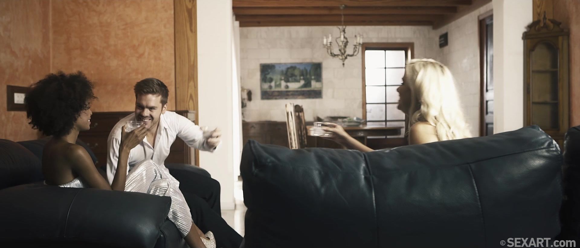 Swinging couple Dido A and Ryan Ryder have a “Special Friend” in Luna C, the kind of friend we’d all love to have as a guest in our home. Ebony beauty Luna arrives to hang out with the lovers and everyone knows why she’s there – to get laid. The fun kicks off swiftly; before anyone’s finished their drink, sexy blonde Dido is pulling Luna onto Ryan’s lap to kiss her passionately. Ryan sits back and relaxes as the two gorgeous babes get frisky, Luna grinding on his lap in just her panties, reaching up to slip a hand under Dido’s dress and finger her naked pussy. She pulls up Dido’s dress and licks her shaved slit as Ryan plays with her hard nipples. Unzipping Ryan’s pants to free his rigid cock, the women take turns to suck him, Luna deepthroating him avidly as Dido kisses him and strokes his balls, then switching so Dido gets her taste of his thick prick. Luna is first to ride it, mounting Ryan in reverse cowgirl so she can kiss Dido and fondle her perfect breasts as she slides up and down on her man’s pole. Luna turns around into cowgirl, with Dido squeezing her ass cheeks as they bounce, and diddling herself as she takes in the delicious show. Luna climaxes noisily, and climbs off to let Dido lick her cream from Ryan’s shaft before mounting it herself as Luna straddles his face. Luna spanks Dido’s ass as she rides hard and fast, getting off on the sight as Dido has a powerful orgasm and keeps on fucking until she has another and Ryan fills her with his hot load. They drink a toast to their friendship before the women take a shower that looks set to get Ryan riled up all over again…