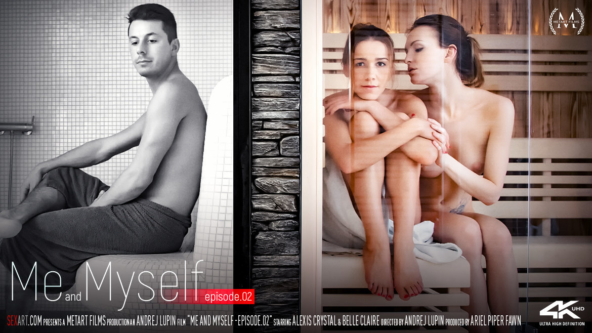 The concluding episode of Andrej Lupin’s stylish and sensual two-parter “Me and Myself” finds sexy Alexis Crystal chatting to her alter ego about her sexual exploits. This time, Alexis recalls a sauna encounter with tattooed Czech beauty Belle Claire. Mirroring the previous episode’s opening, it begins with Belle naked, her eyes closed, as Alexis watches her with an expression that suggests she has seduction in mind. She sidles closer and slips a hand between Belle’s thighs. The gorgeous redhead willingly spreads her legs and responds eagerly to Alexis’s passionate kisses; they press closer, Alexis caressing Belle’s beautiful breasts and sliding a hand down to stroke her pussy with its neat triangle of hair. Alexis squats with legs apart to get eaten, Belle’s flickering tongue and thrusting fingers stimulating her sweet shaved pussy until she’s gasping with excitement. Alexis kisses Belle hungrily, tasting her own cream from her lips, then laps hard and deep at her juicy pussy. She slides two fingers inside Belle as she sucks on her clit, making her arch her back and tremble uncontrollably as she climaxes. They cuddle up close and Belle thrusts her fingers into Alexis again, diddling her to an explosive orgasm. Back at her apartment, Alexis and her alter ego celebrate their sexual conquests by raising a glass to “Me and Myself.”