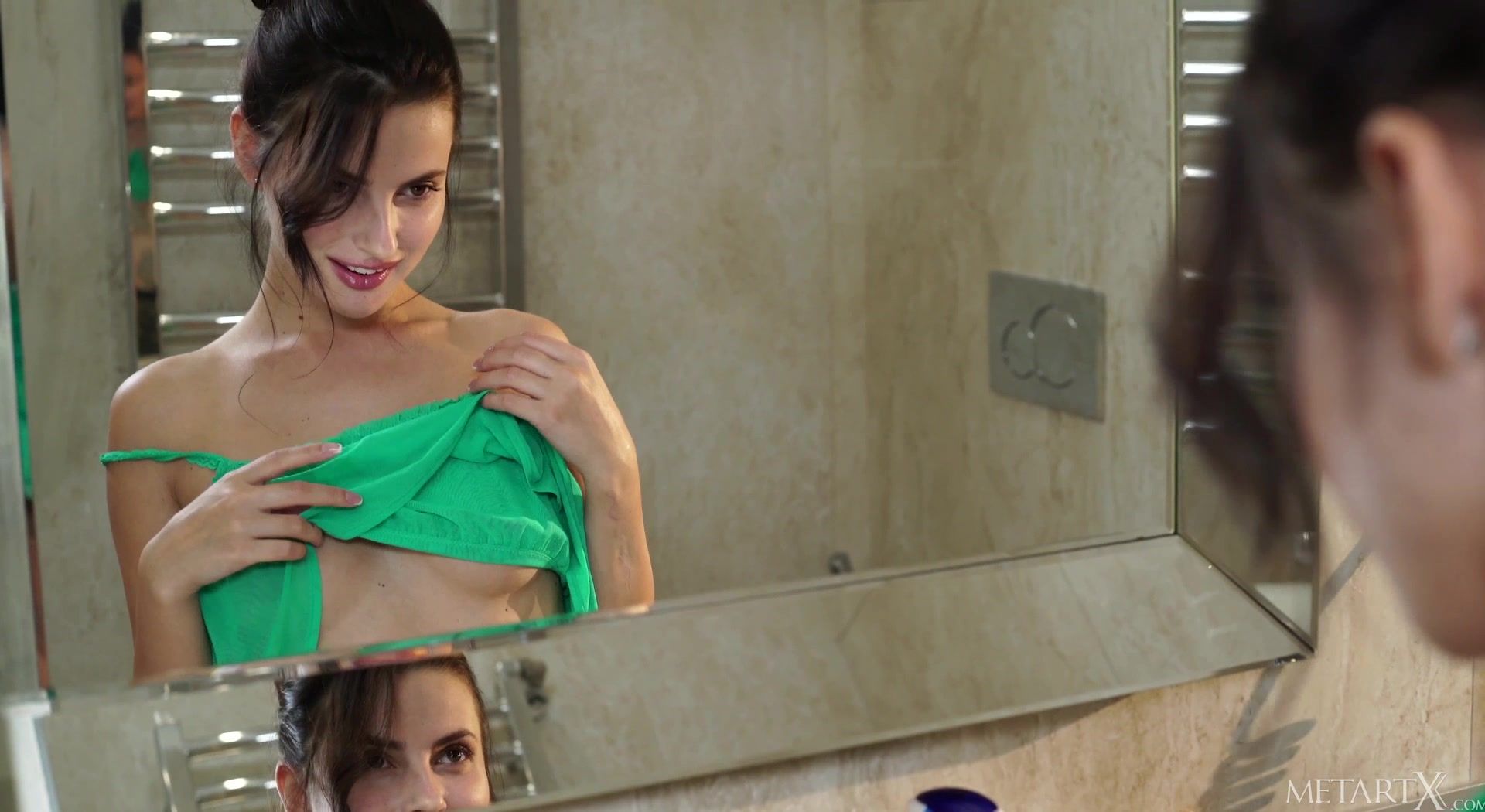 Stunning brunette Jasmine Jazz watches herself in the bathroom mirror as she runs her hands over her sexy body. Stripping naked, she steps into the jacuzzi and soaps up her beautiful breasts, then begins to stroke her hot pink pussy, gasping with pleasure. Sitting with thighs spread wide, she strums her clit and sinks her fingers inside her wet slot, boobs jiggling as she frigs avidly. She stands to ride her fingers hander, bending over with her perfect ass up as she masturbates harder. Finally she squats in the water to fingerbang herself to a powerful orgasm.