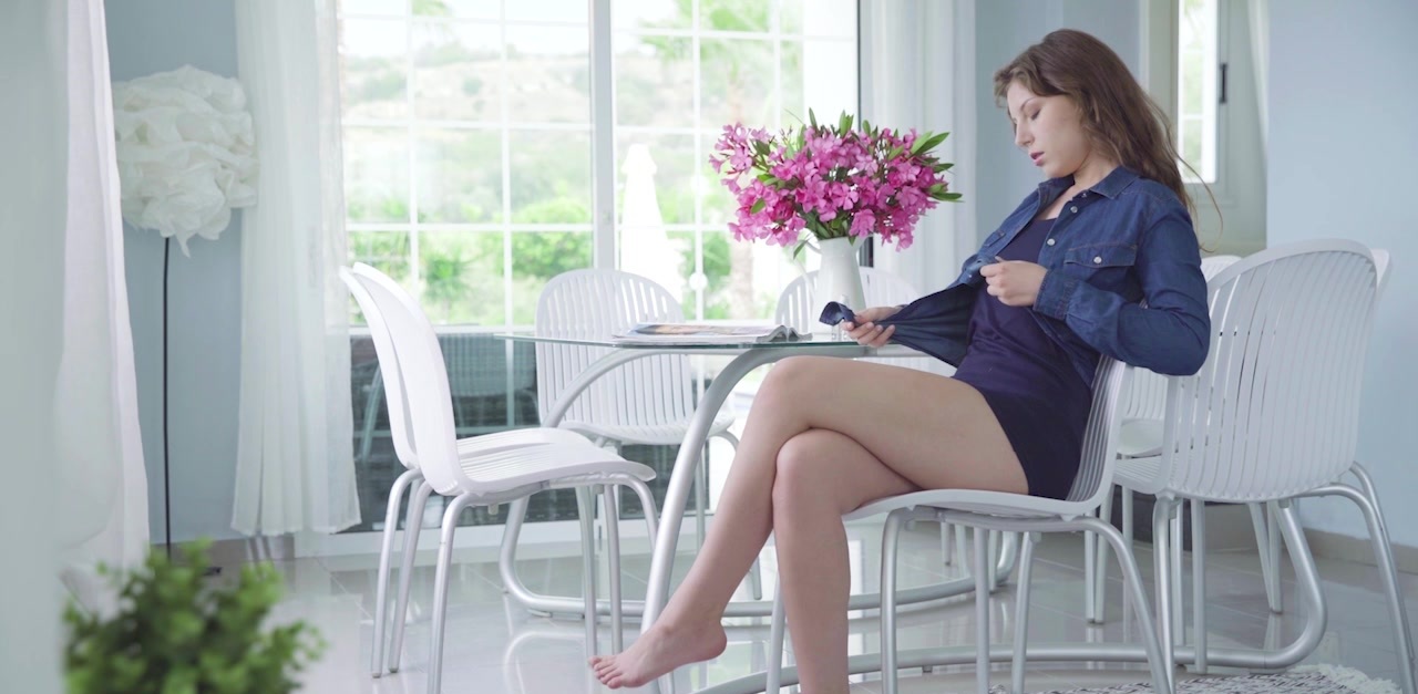 Casually painting her nails, beautiful brunette Satin Stone needs to find something to do while she lets them dry. Leafing through a magazine soon becomes tiresome. Besides, she finds her own body much more entertaining. Parting her thighs, she runs a hand over her panties, her skirt giving her full access. And suddenly, she forgets that she's supposed to let her nails dry, lost in her own lusty desires. She pulls down her T-shirt, squeezing her gorgeous breasts, yanking her panties aside to allow her fingers a chance to explore. Feeling her way between her juicy folds, the horny babe strips down to her panties and gets on her knees. Her desire is in control as she tugs her underwear down around her thighs and reaches over her peachy ass cheeks to plunge two fingers inside her tight, shaved pink pussy.