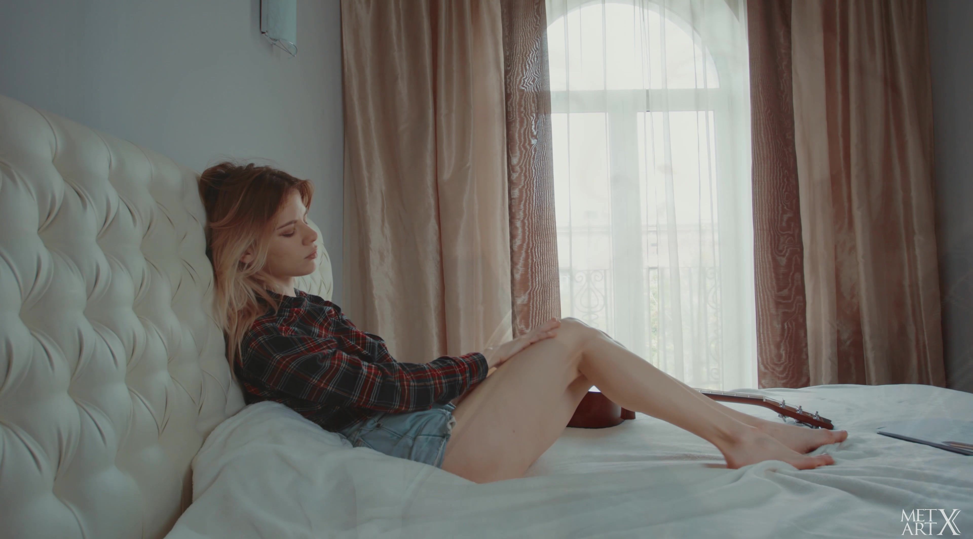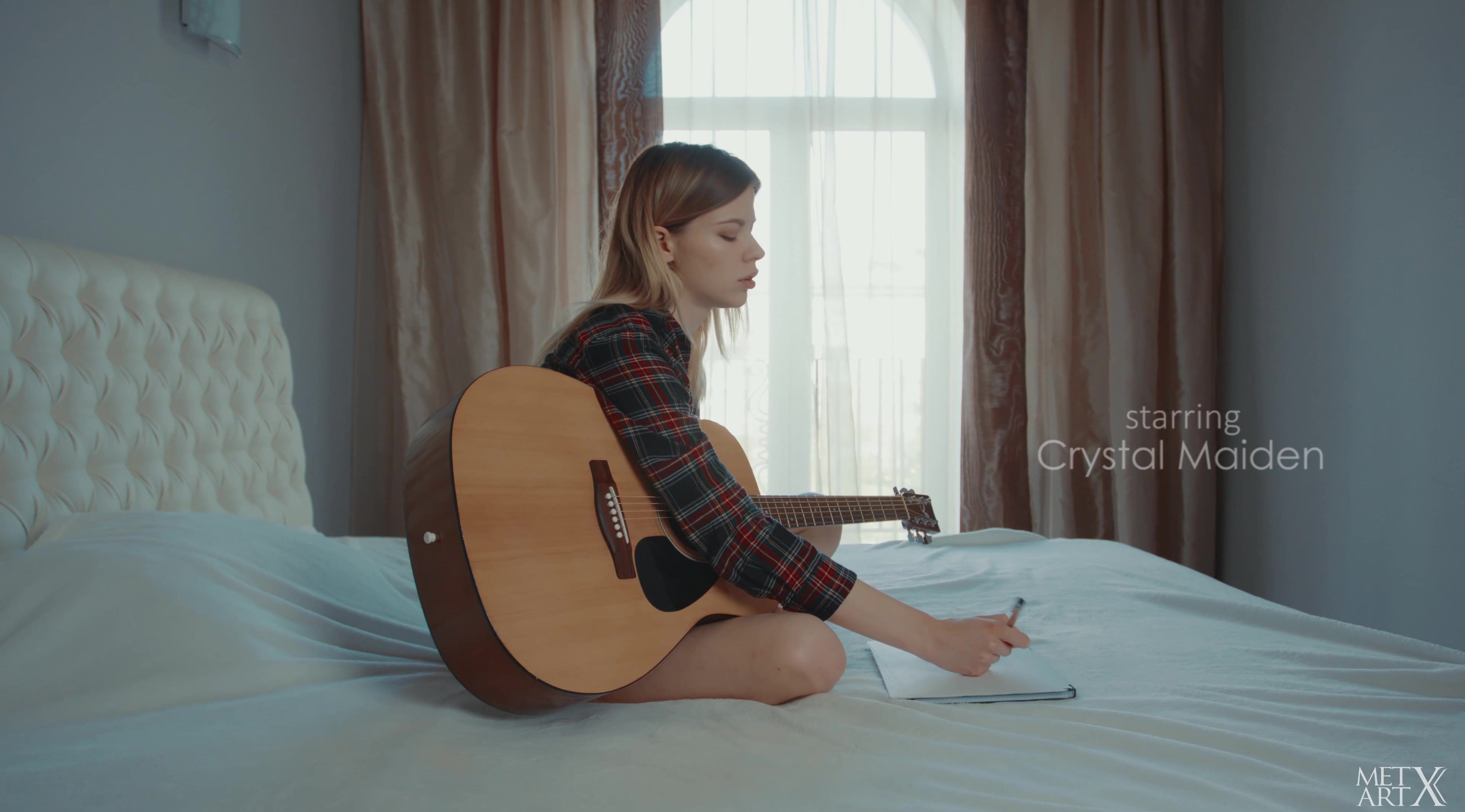 Natural beauty Crystal Maiden switches from composing a song on her guitar to something more intimate and sexual. The hot Ukrainian blonde puts the instrument aside and takes off all her clothes, propping herself up against the bedhead with her legs open and her shaved pussy and small, perfect breasts on full display. Her eyes close as she rubs the fleshy folds of her pussy, and she pants erratically as she speeds up her finger action. Getting up into doggy, she slips a hand between her legs and rubs at her wet pussy even harder, before flopping down onto her back and racing towards an intense climax.