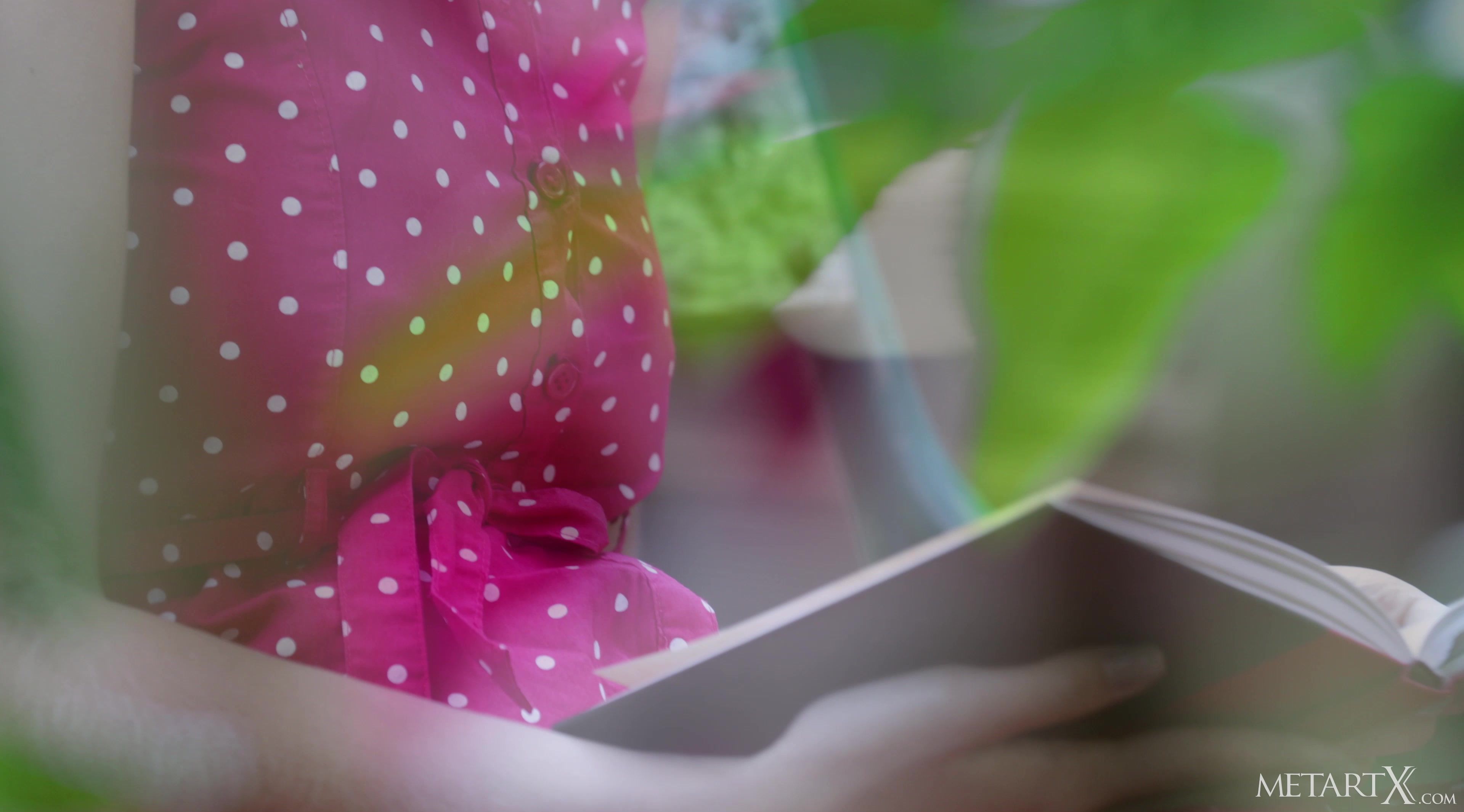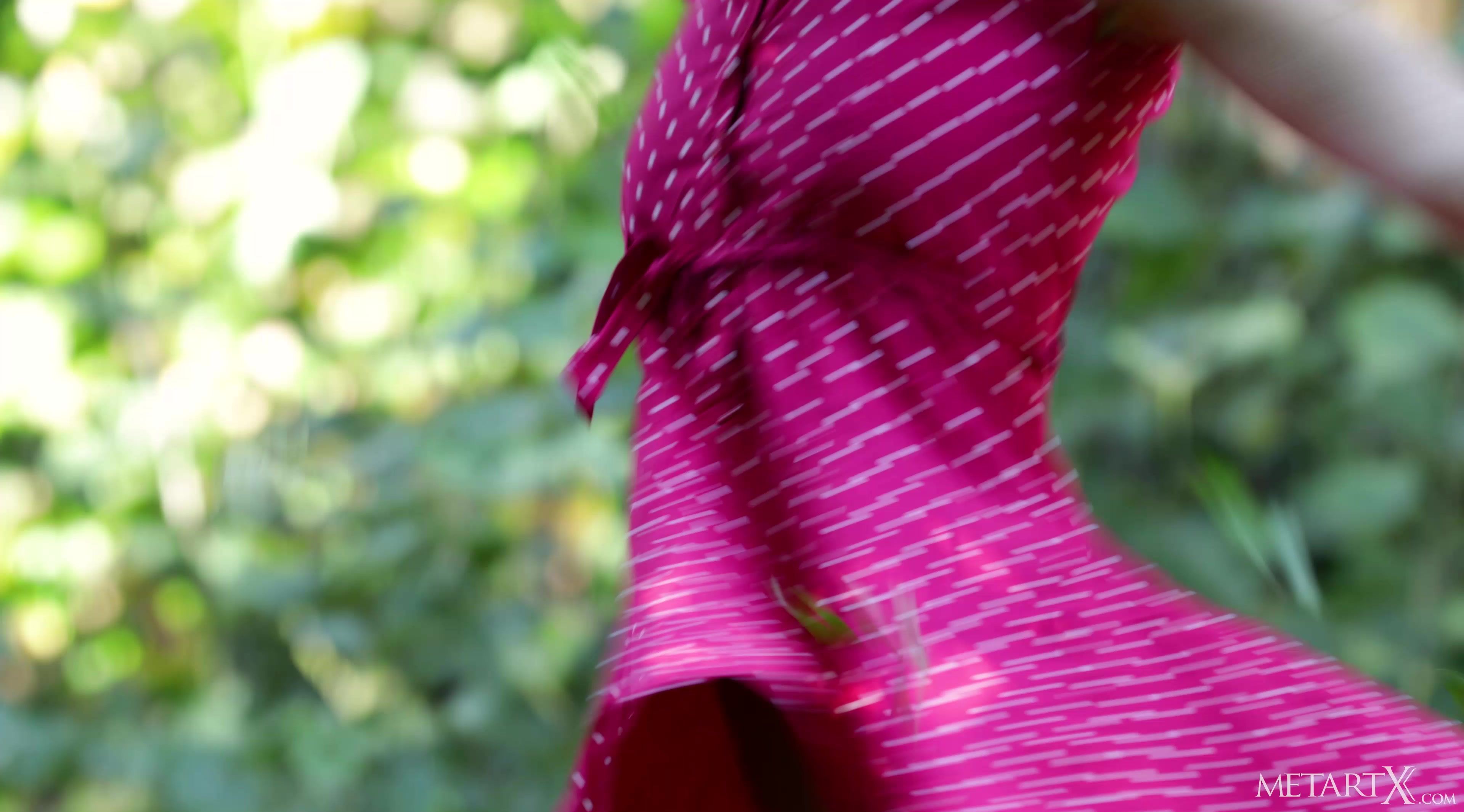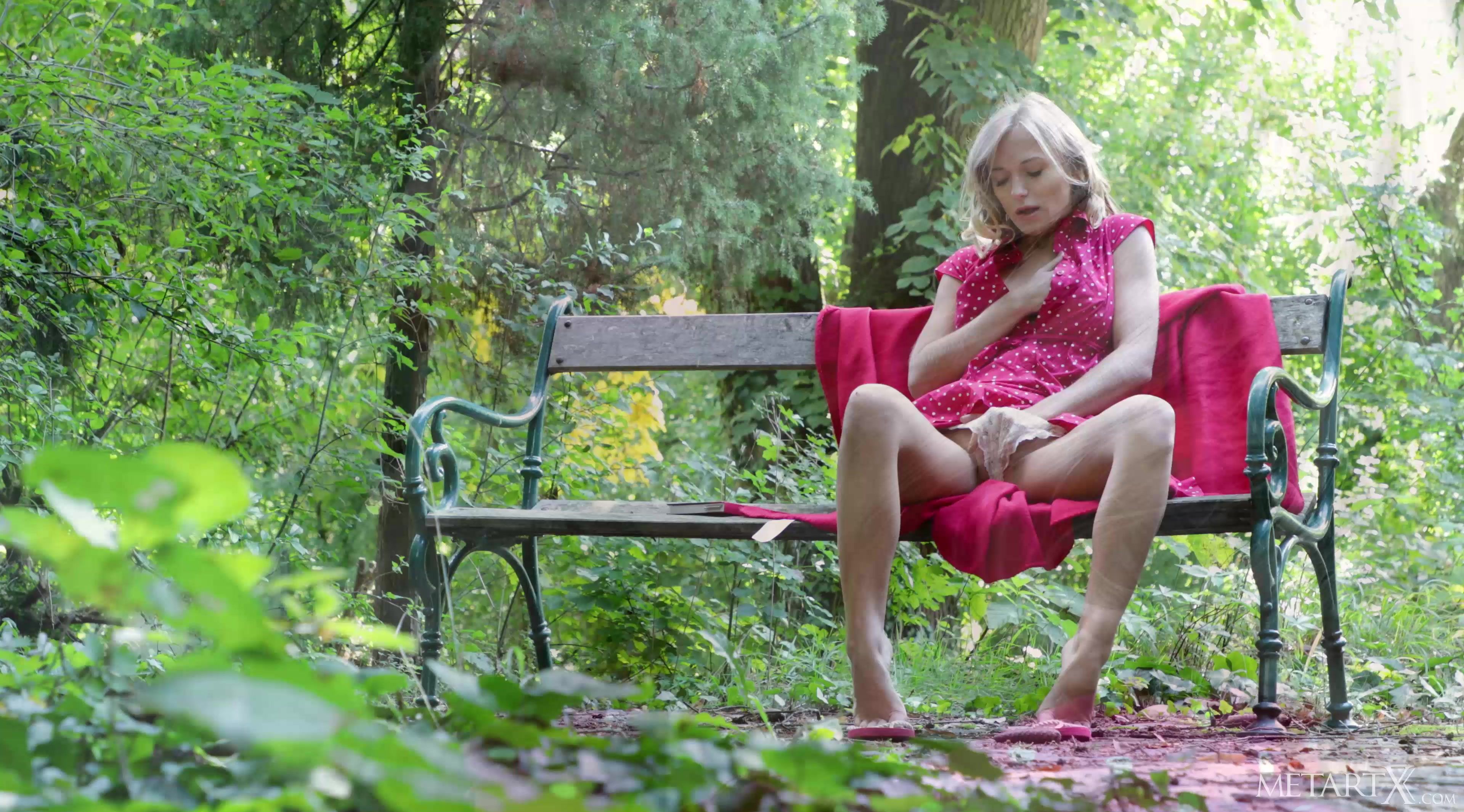 Gorgeous blonde honey Aislin sits on a bench in the sun, reading a book. When her mind shifts to thoughts of a sexual nature, the lovely Latvian gets aroused and starts caressing herself through her summery dress. Within moments she’s fondling her beautiful breasts while playing with herself inside her panties, until she pulls them aside so she can rub her fingers along the fleshy folds of her tender, shaved pussy. As her arousal level rapidly rises, she starts gasping breathlessly, her fingers flying faster up and down her sticky slit, driving her to a delicious orgasm.