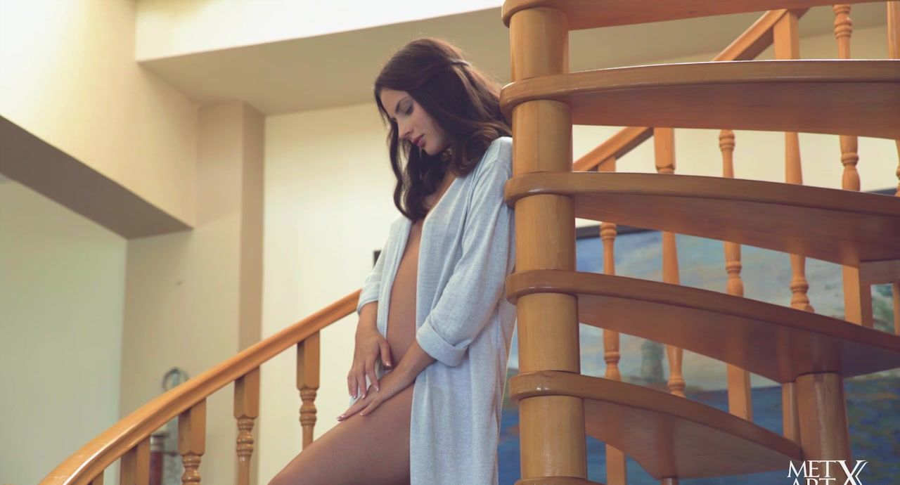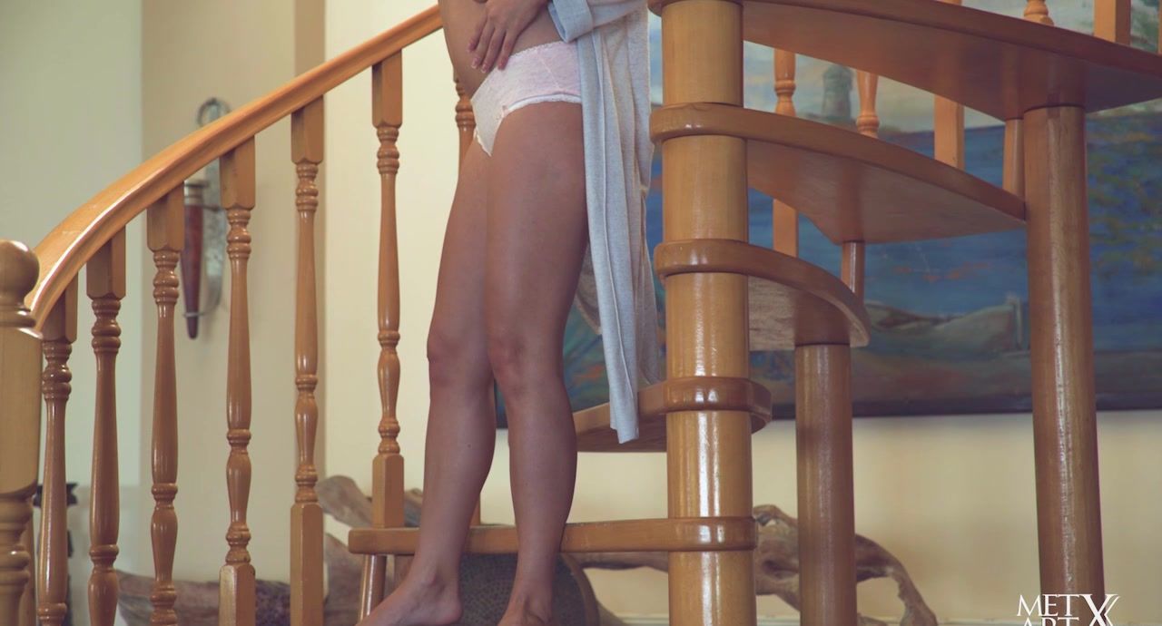 As petite hottie Jasmine Jazz descends the stairs, she opens her robe to flash her pink panties that have a huge cat’s head printed across the rear of them. Dropping the robe, she massages her body all over, before sliding her panties down to her knees, and snaking a hand between her slightly parted legs so that she can frig her shaved pussy. She moans with pleasure, spins around, and sits down, so that she can resume fingering her honey hole and frantically rub her clit, while simultaneously fondling her beautiful breasts with her free hand. Suddenly she stares straight at the camera, her cries of passion rise in volume, her finger flies faster and faster in and out of her wetness, and she has an intense orgasm.