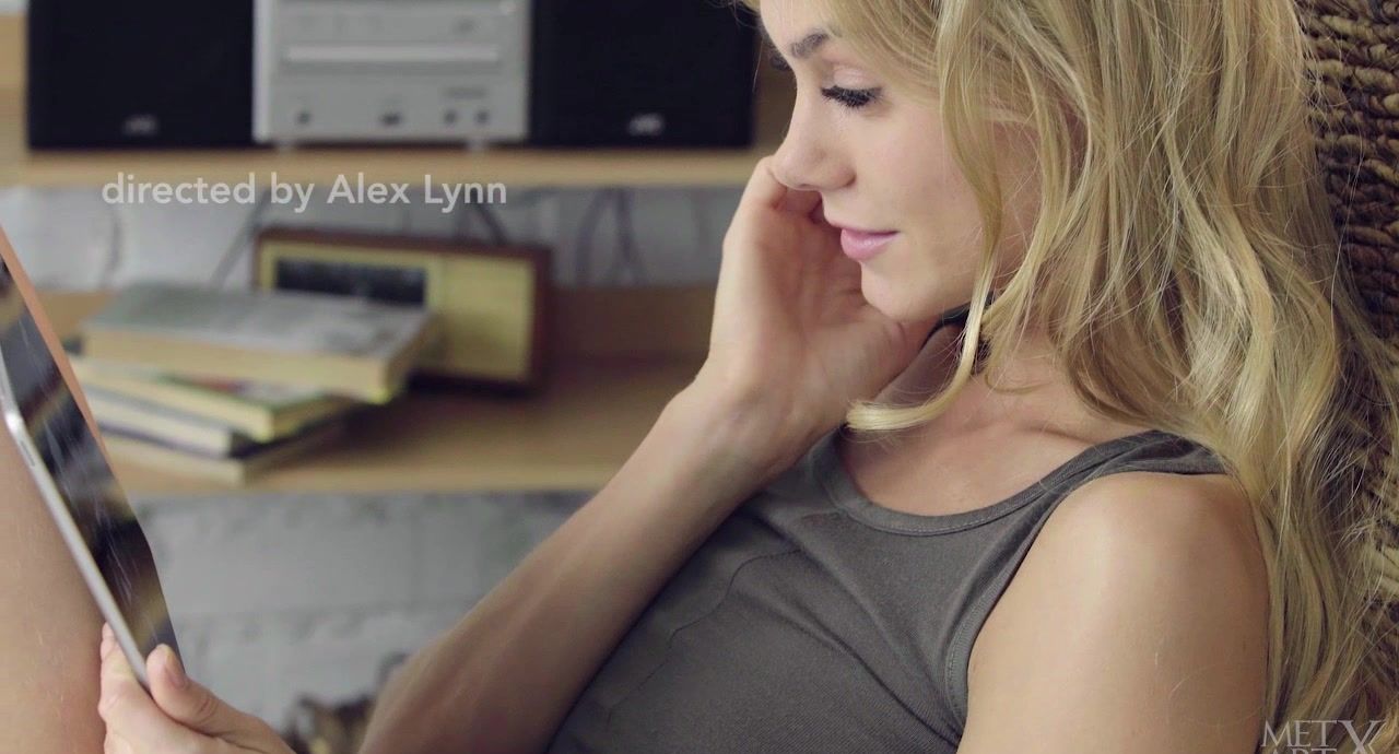 Blonde haired, blue-eyed babe Nancy A gets turned on watching a film of herself on a tablet. The gorgeous Ukrainian starts stroking herself sensually from her beautiful neck to between her legs. Her eyes close and she slides up her top to expose her large yet firm breasts, and massages them lovingly. Evidently super aroused and with a hand inside her panties stroking her pussy, the camera zooms in on the tablet to reveal the on screen developments – Nancy is watching a film of herself finger banging her wet pussy. She strips slowly, and once she’s naked her finger play accelerates and she rubs her clit and shaven labia frantically. As she’s reaching boiling point, she slams two fingers deep inside and rides them to orgasm.