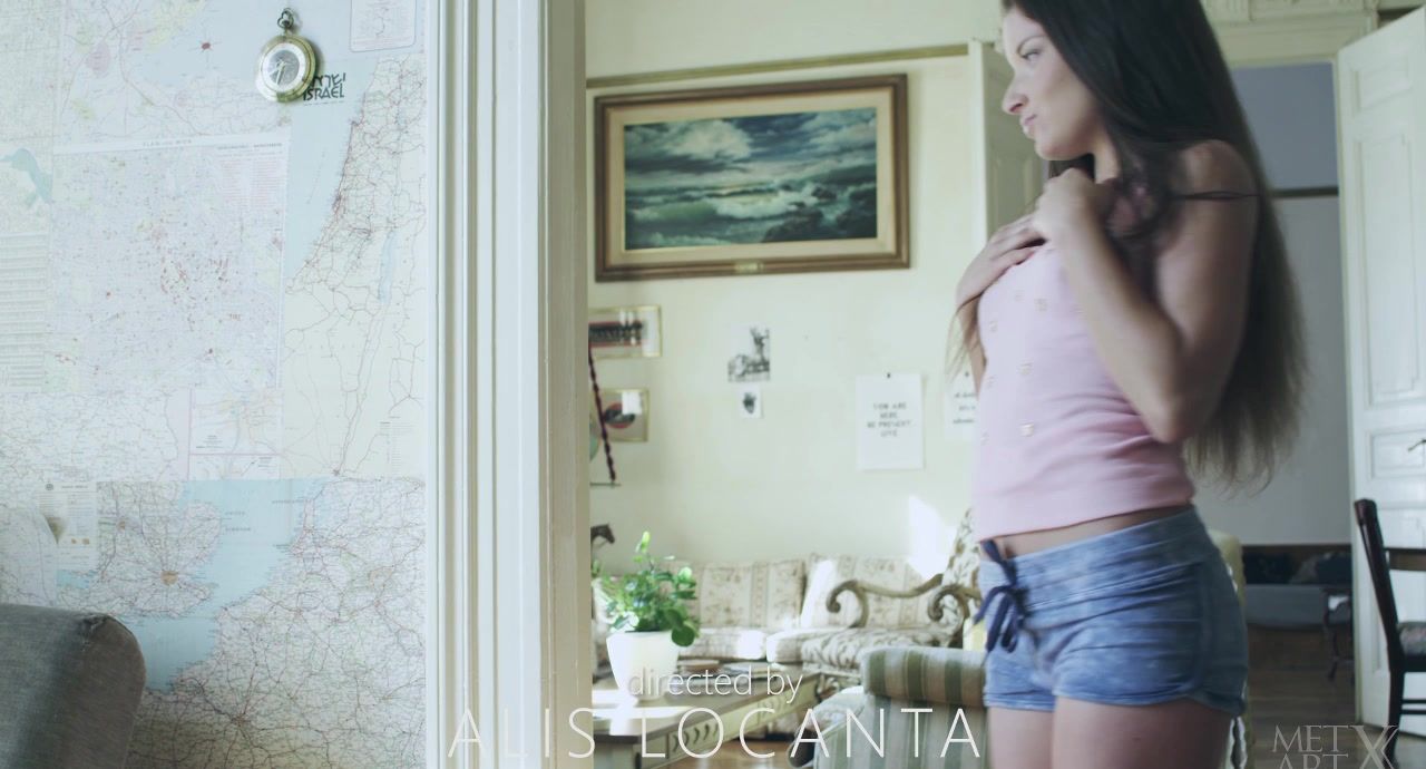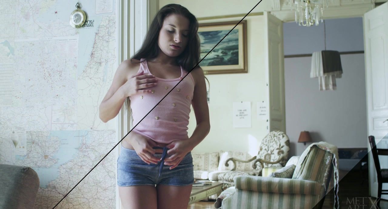 Petite Anita Bellini is feeling sexed-up and craving solo stimulation. The Hungarian sex kitten flicks her long brunette hair and fondles herself through her singlet and shorts. After a short tease, she slowly pulls up the top and takes off the shorts to unveil her gorgeous body with its shaved pussy and tiny tits. She tugs her pink, erect nipples and pants loudly as she caresses her shaven haven. Her body undulates sensuously as her stimulation levels rise, and she slips a finger deep inside her eager for maximum attention pussy. Anita loses control as she thrusts the digit harder and faster, until she climaxes.