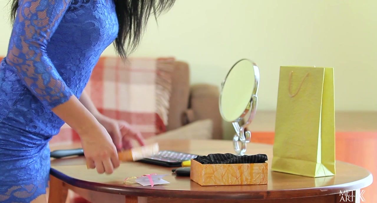 Sex kitten Solana is getting ready to head out for a party when the urge to stay in and sex herself up becomes so overwhelming, she decides to go with the flow. Stripping down to her underwear, she’s so aroused that she has to lean against a wall to steady herself while masturbating. She relocates to the sofa in only a peek-a-boo bra, and with one foot up on the table starts double dipping her fingers deep inside her thoroughly juiced-up pussy. The she flips herself over and does the same from behind, until she comes, panting loudly.