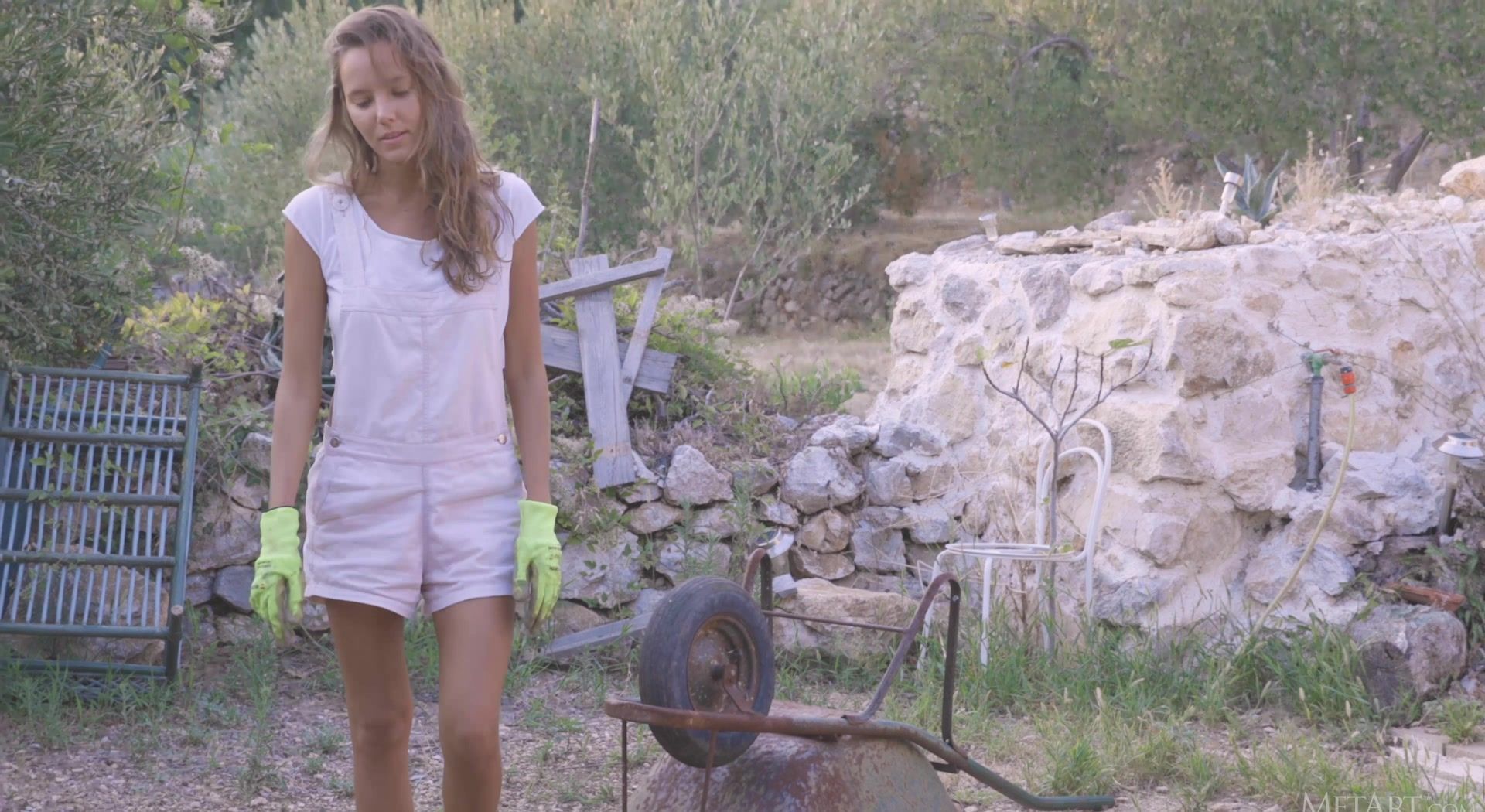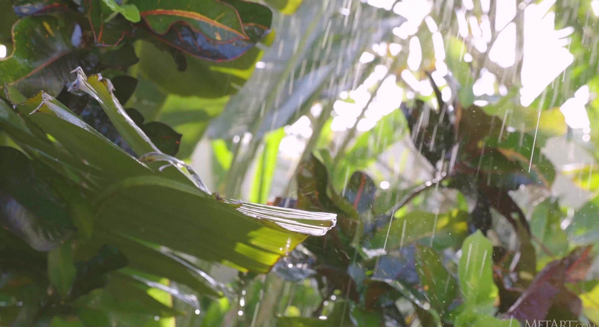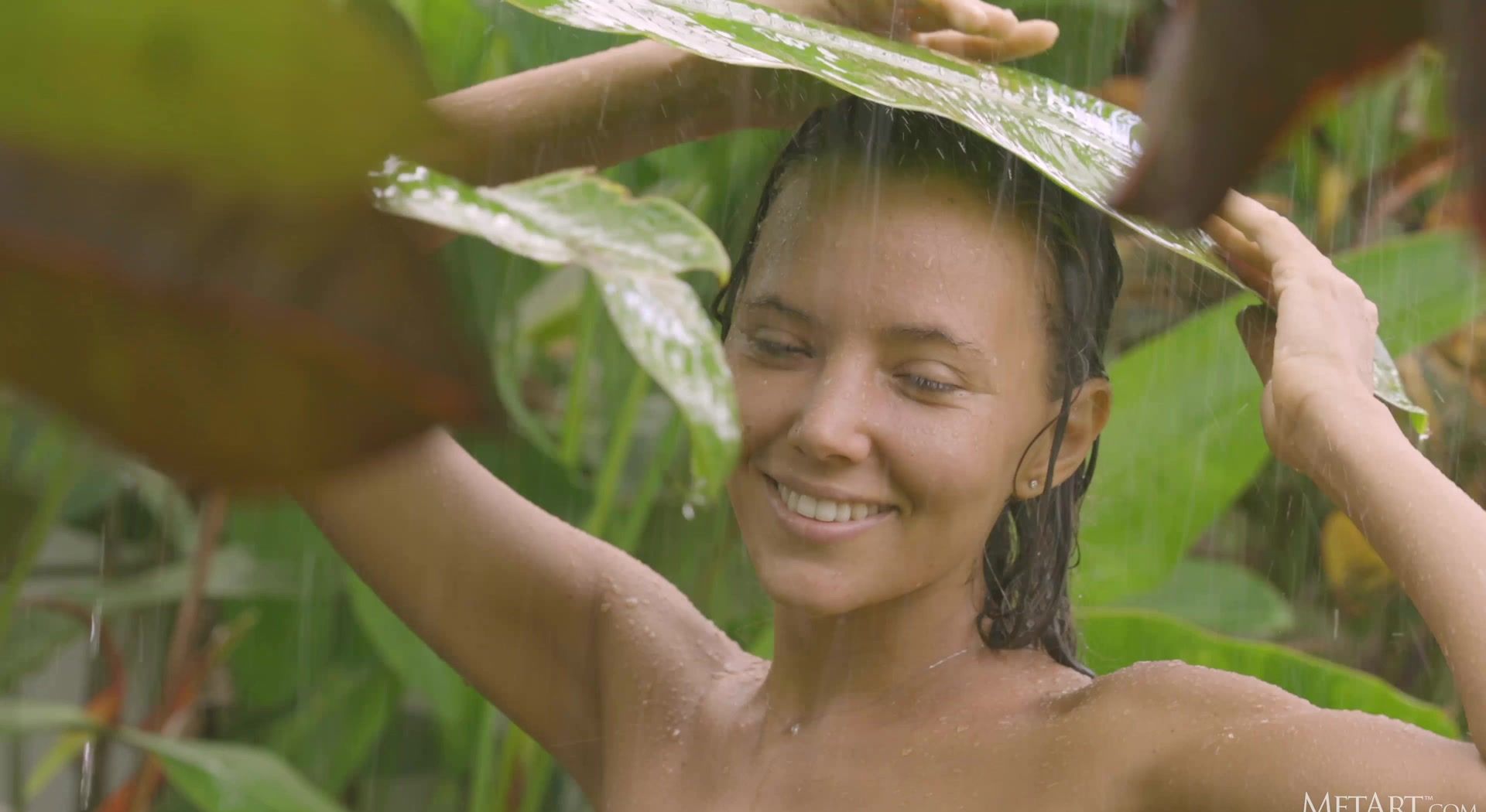 Stunning Mango A takes a break from her yard work to enjoy a refreshing drink, and has an erotic flashback. Standing under a downpour in a tropical garden, the beautiful blue-eyed brunette is immediately drenched, her white crop top and panties turning transparent. Nipples stiff, she runs her hands over her slender, athletic body, lifting her top to expose her gorgeous breasts. She peels off her soaked panties, baring her shaved pussy and perfect ass. Her movements are sensual, her smile radiant.