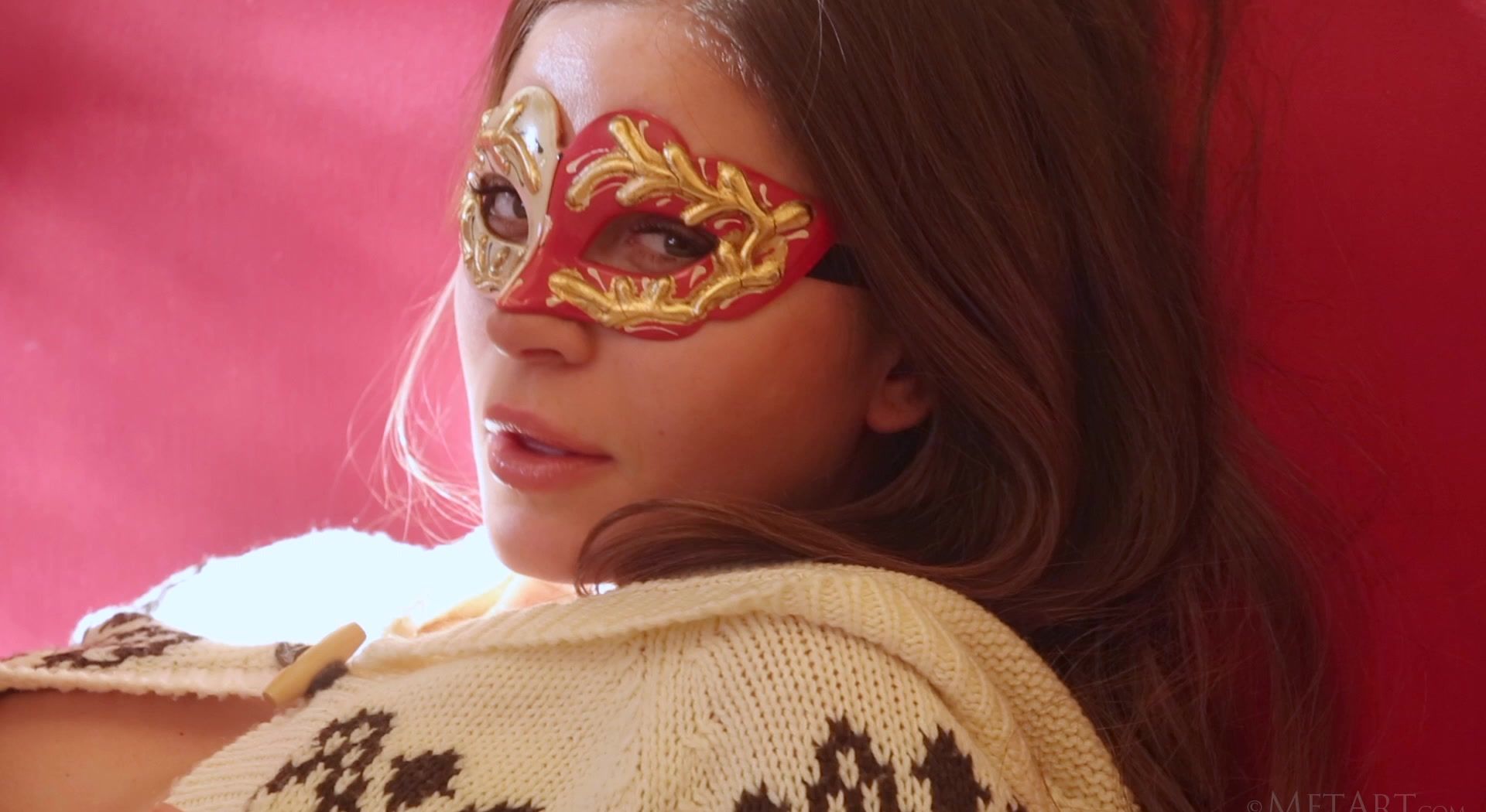 Beautiful brunette Lily C wears an exotic mask that triggers horny memories. Taking off her cropped sweater to reveal lovely small breasts, the sultry Ukrainian babe runs her hands over her silky skin seductively. Her gorgeous green eyes sparkle with desire as she removes the mask, then pulls her panties down to expose the cute triangle of dark hair that crowns her pussy. Naked, her body language is provocative as she rolls on the bed, displaying her sexy ass so flirtatiously.