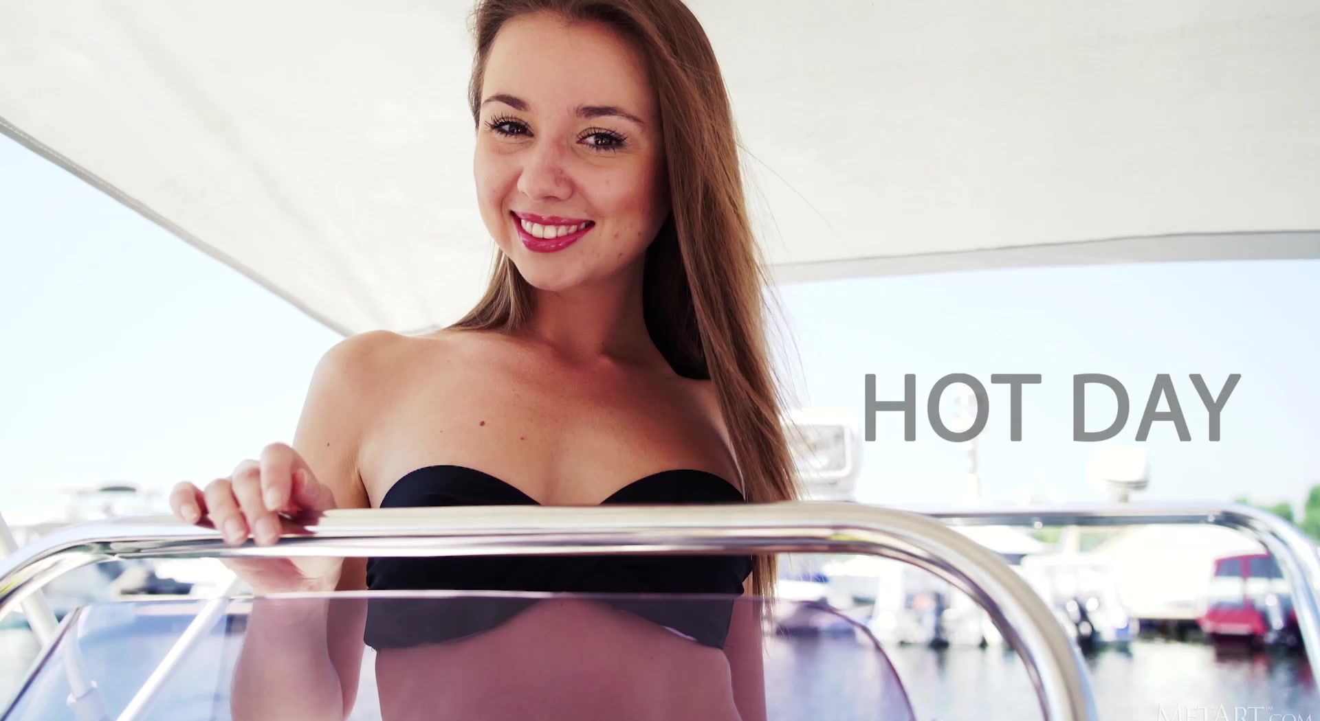 Cute brunette Linda Chase is out on a boat on the water on a sunny day, looking adorable in her skimpy black bikini. She flirts so sweetly, blowing kisses, running her hands over her petite body. Hair tousled by the summer breeze, she takes off her bikini top to reveal her sexy tan-lined breasts, then loses her panties too, baring her plump-lipped, shaved pussy. The luscious close-ups show her to be a stimulating travel companion.