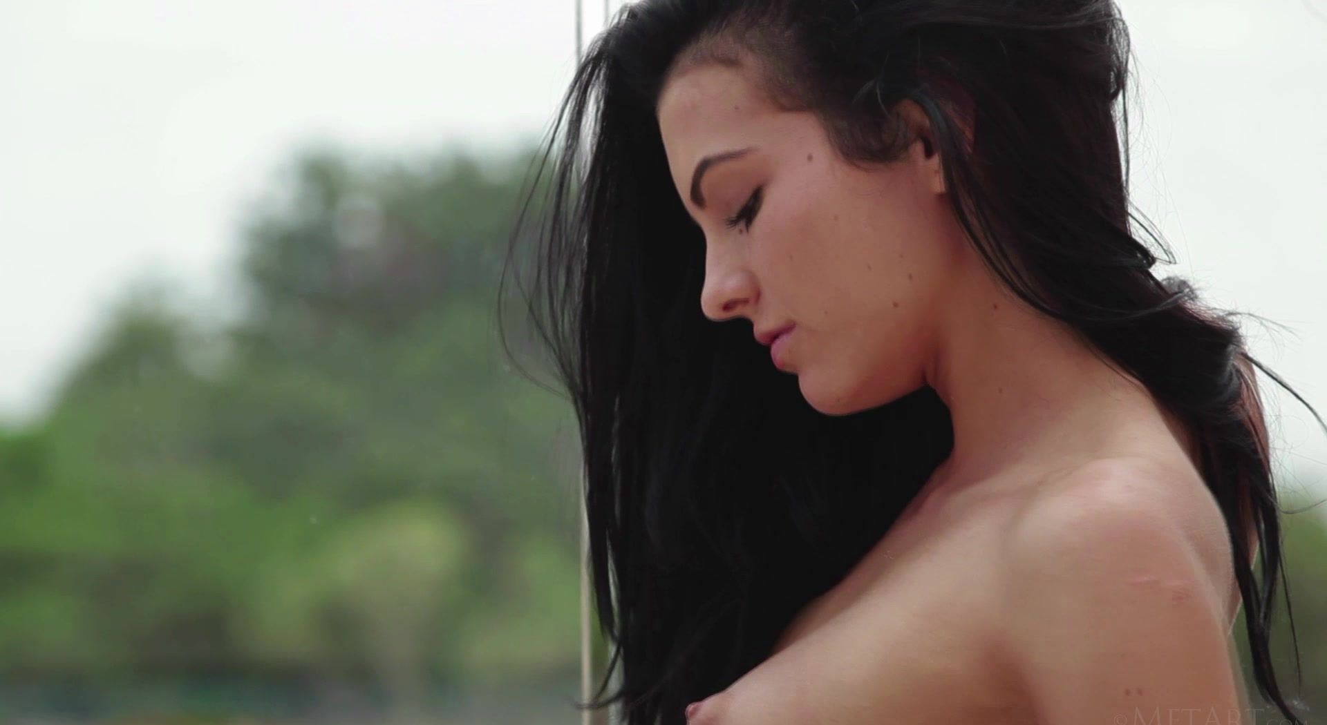 Captivating Czech beauty Sapphira A hangs out by the pool in her stars and stripes bikini looking a million dollars. An enchanting sight, she looks up from under her glossy brunette hair with dark, sultry eyes as she plucks at the ties of her swimwear, letting her bikini fall from her graceful, tanned body. Naked, she opens up, spreading her legs apart to expose her shaved pussy, with luscious plump labia. Stepping inside, she dresses in a revealing outfit, a white bra that doubles as a dress split down the middle to expose her naked pussy completely. She kneels on the couch and parts her thighs, her perfect ass a hypnotic sight.