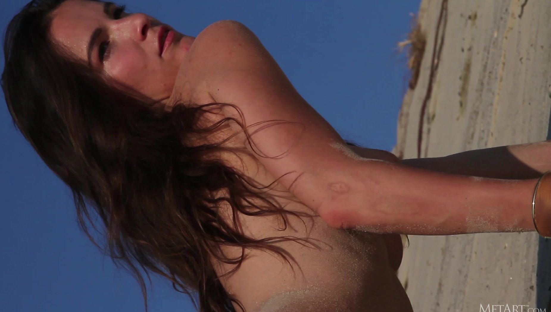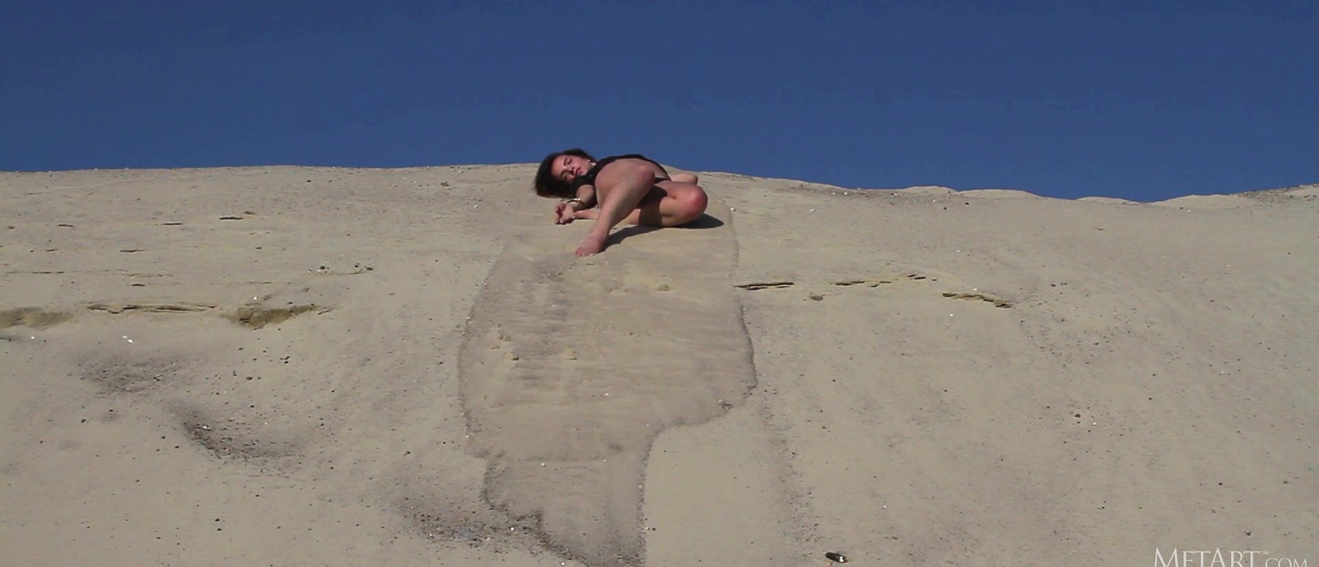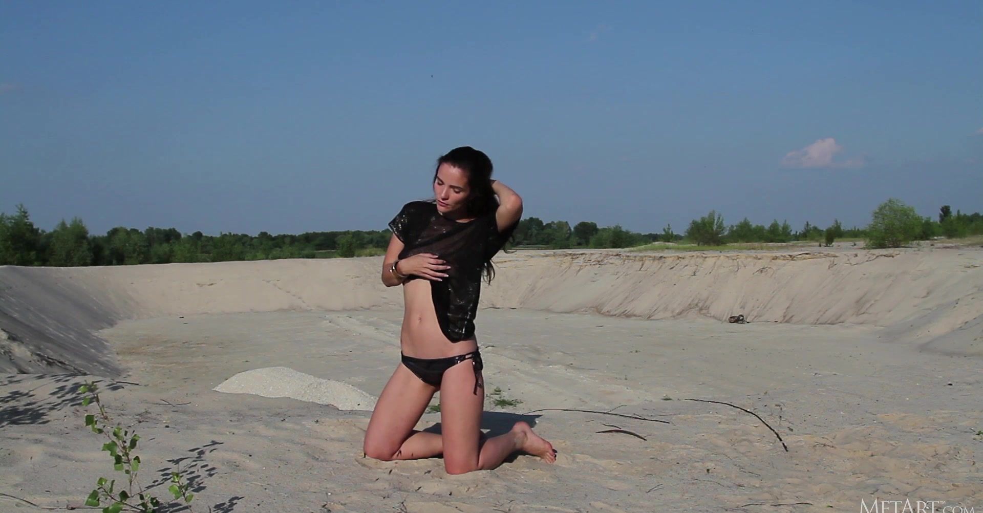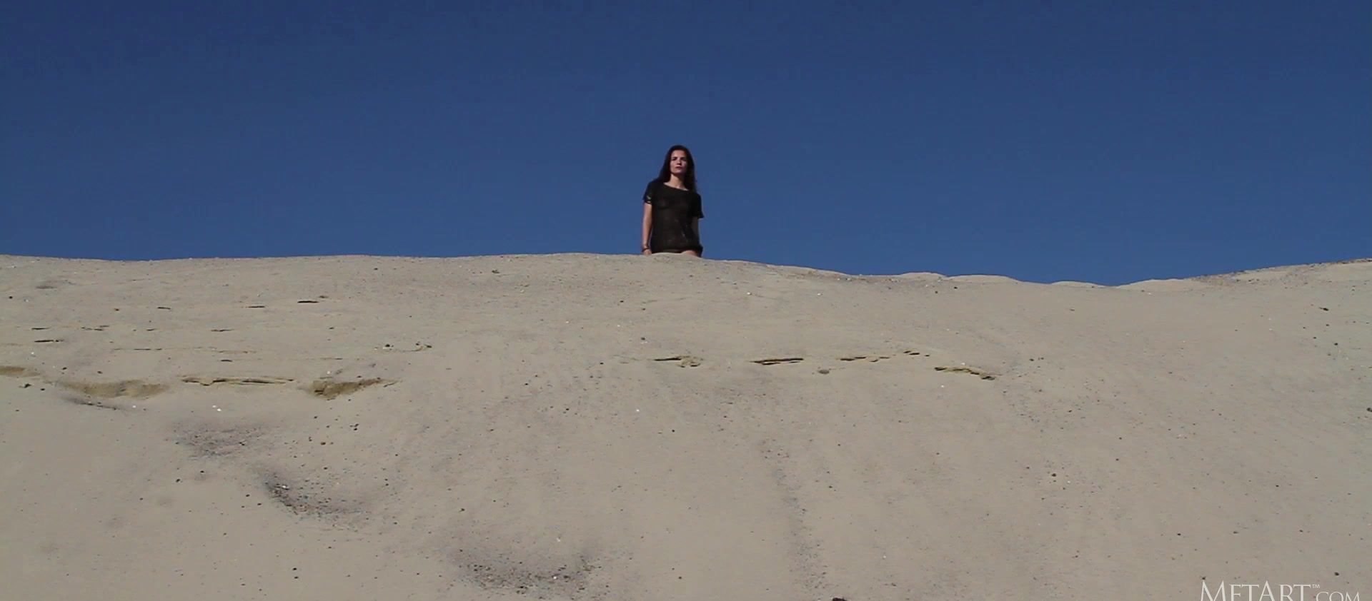 Stunning Russian brunette Ulya I looks irresistible in her black metallic bikini briefs and sheer black top. Her breasts carve an alluring shape in her T-shirt, a mouthwatering prospect. Down in the sand, she kneels and pulls her top off, revealing those perfect titties, nipples dark and tempting. She writhes in the golden sand, dusting her skin with it, rolling over and over, covering herself. Watch as she reaches for the ties of her briefs and slowly undoes them, her panties falling from her slender thighs to leave her naked, a thin strip of dark pubic hair rising from between her legs. Her body, coated with sand, is incredible, a beautiful figure from every angle, a goddess in gold.