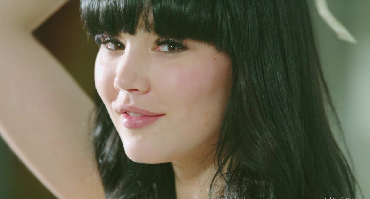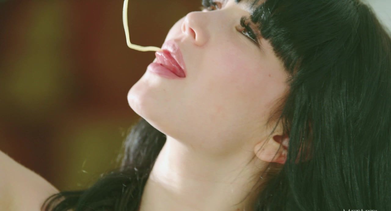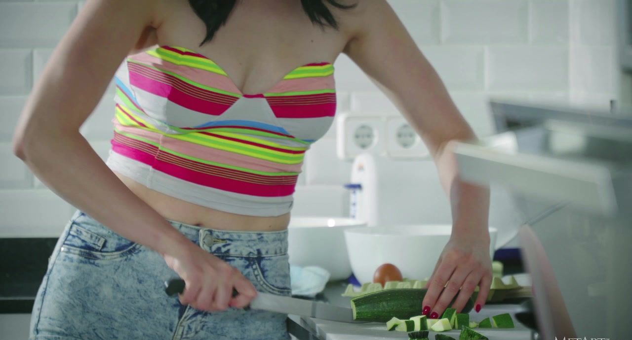 Sexy Ukrainian hottie Malena is a master chef in the kitchen. The black haired, brown-eyed Eurasian beauty transforms food preparation into a seductive, sensual act, which inevitably leads to her arousal level soaring off the scale. She slowly takes off her denim cutoffs, and turns away from the camera to flash her black thong, which nestles between the cleft of her perfect ass. Lifting her multicolored top over her head, she reveals her big yet fabulously firm breasts. She closes her eyes, stretches her slender body, and runs her fingers all over her silky skin, before slipping out of her thong and exposing her sweet, shaved pussy.