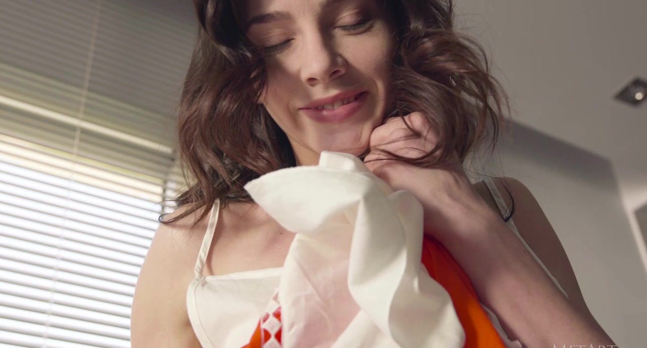 Stunning Adel Morel is flicking through a magazine when a strap on her dress keeps slipping down, so she takes advantage of the fact and starts massaging her small beautiful breasts. Evidently in an advanced state of arousal, the Ukrainian brunette starts tugging at her clothing as she moves restlessly around on the couch. She takes off her dress and pulls her panties down over the delicious curve of her ass, then sits back and shows off her pussy, which is shaved smooth – before sliding the panties completely off. She smiles as her hands roam all over her silky smooth skin, paying extra special attention to her most precious, intimate areas.