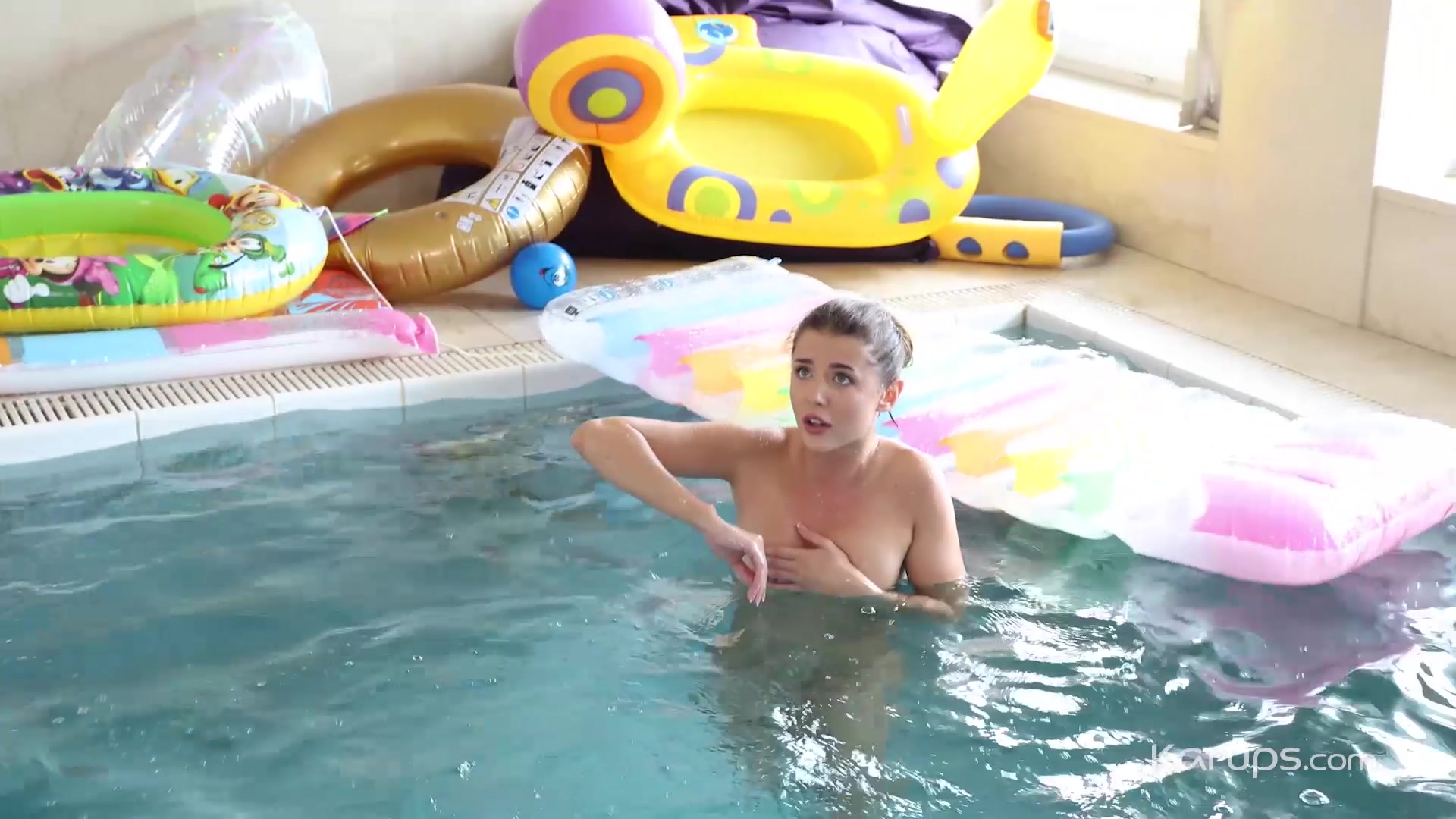 Sybil is not the kind of woman you would refer to as shy. This afternoon she was at her apartment complex's pool taking a swim when she took her bikini off so she could do a little skinny dipping. She was floating around on an air mattress showing off her tight, sexy body when one of her neighbors came in and saw her. She didn't see him as he pulled his big cock out and started to stroke it while looking at her. When she did see him, she wasn't angry, she was turned on and started rubbing her pussy while watching him. Mutual masturbation at the pool is fun but not as fun as fucking! She went back to his apartment with him so they could have a little privacy and it was there that he bent her over the couch, ate her pussy from behind then buried his dick deep inside her trimmed, very tight fuck hole. He hammered the petite cutie's slit until she locked eyes with him and came all over his shaft. Getting on top, she worked up a sweat riding him until she came again, her abs flexing and her body shaking then she let him cum inside her leaving her with a smile on her pretty face and a creampie in her well-fucked pussy.