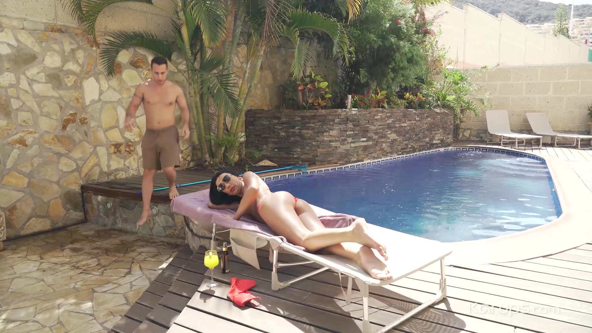 Busty brunette MILF Shalina Devine is sunbathing by the pool when she takes notice of the hot pool guy. She tries to seduce him, and quickly has his cock deep inside her mouth outside. They head in to finish the fucking in this great mature sex scene from Karups.