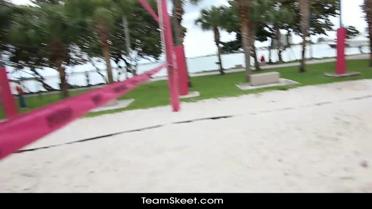 Small beauteous chick Miya Stone has her tiny pussy destroyed by a big cock dude after losing a volleyball game in the beach